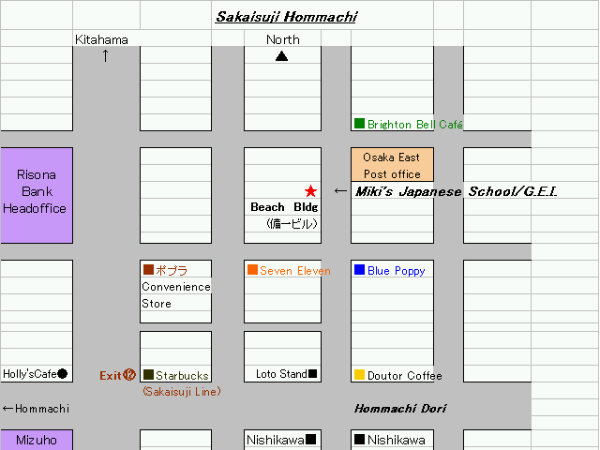 Directions: Take the Sakai-Suji line(brown line) or the Chuo-line(green line) to the Sakai-Suji Hommachi Station. Exit at exit number 12 (the intersection of Sakai-Suji and Hommachi Dori. Walk down Hommachi Dori past the lottery stand and before the Doutor coffee shop. Turn left. Walk straight until you get near the post office on your right side. My school is before the post office on the left. There is a restaurant on the first floor and a vending machine in front. I am on the 7th floor. |